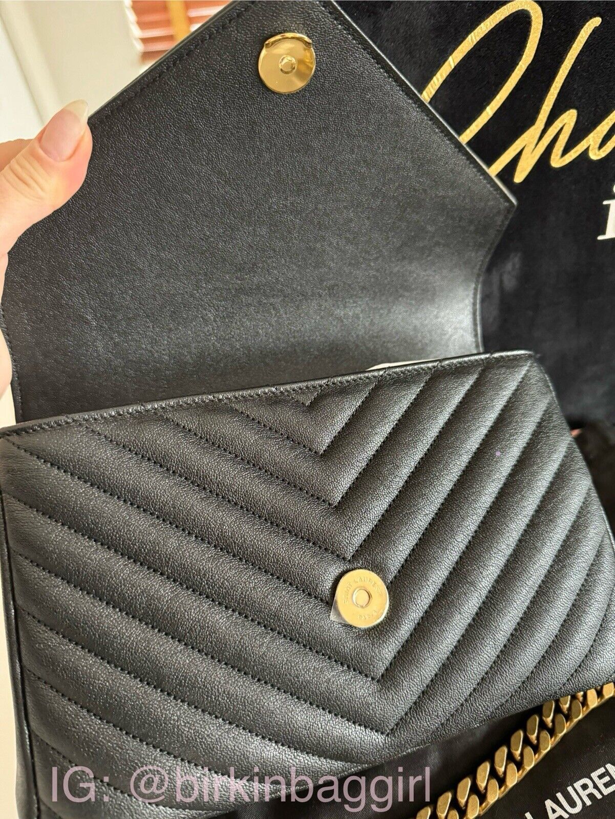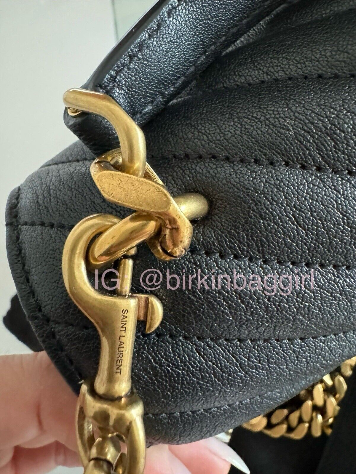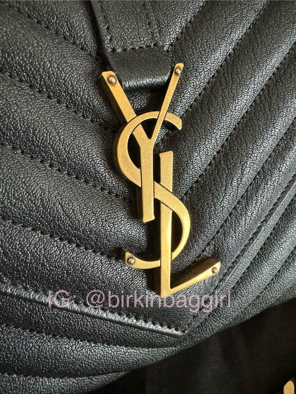 Black textured leather with YSL signature antiqued bronze/gold toned hardware