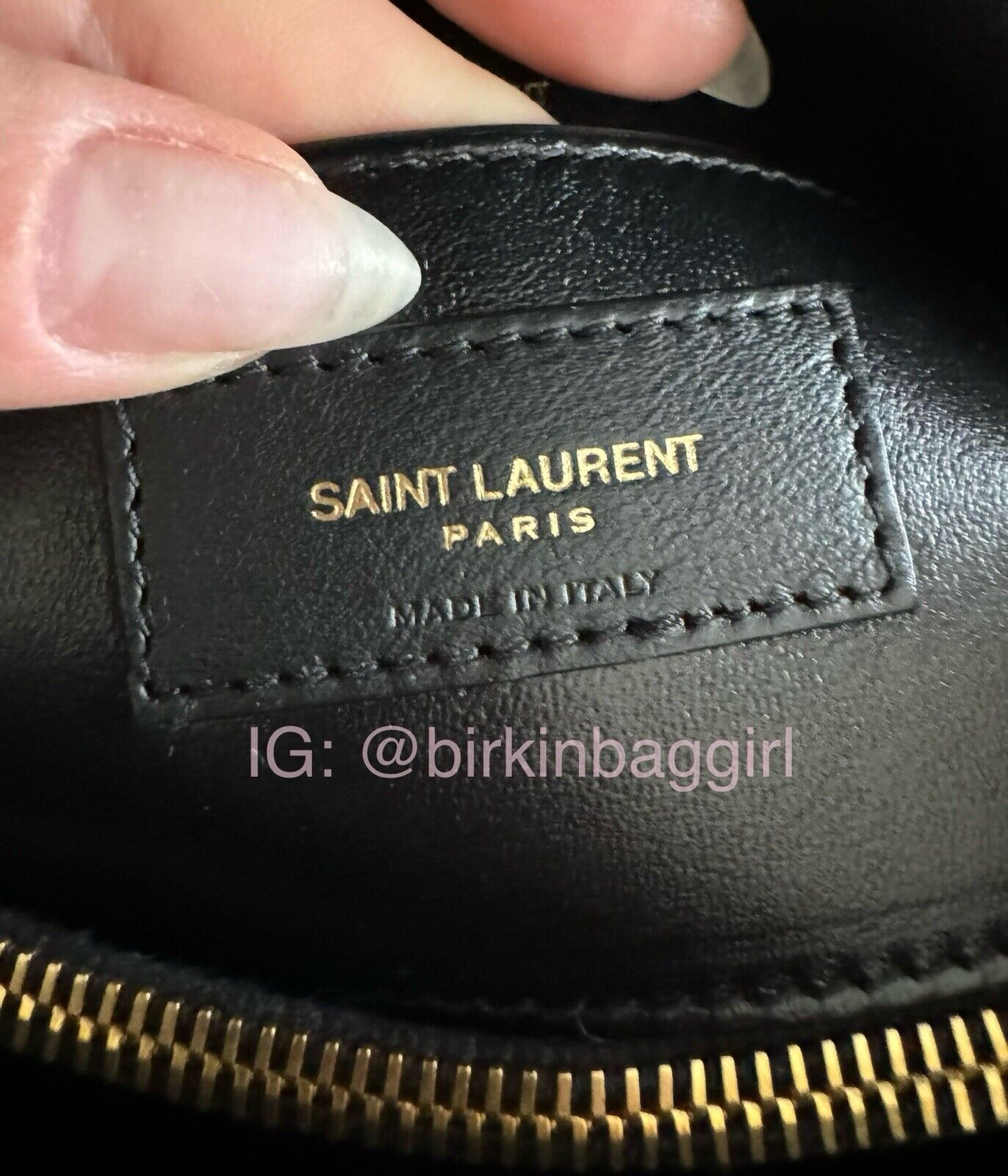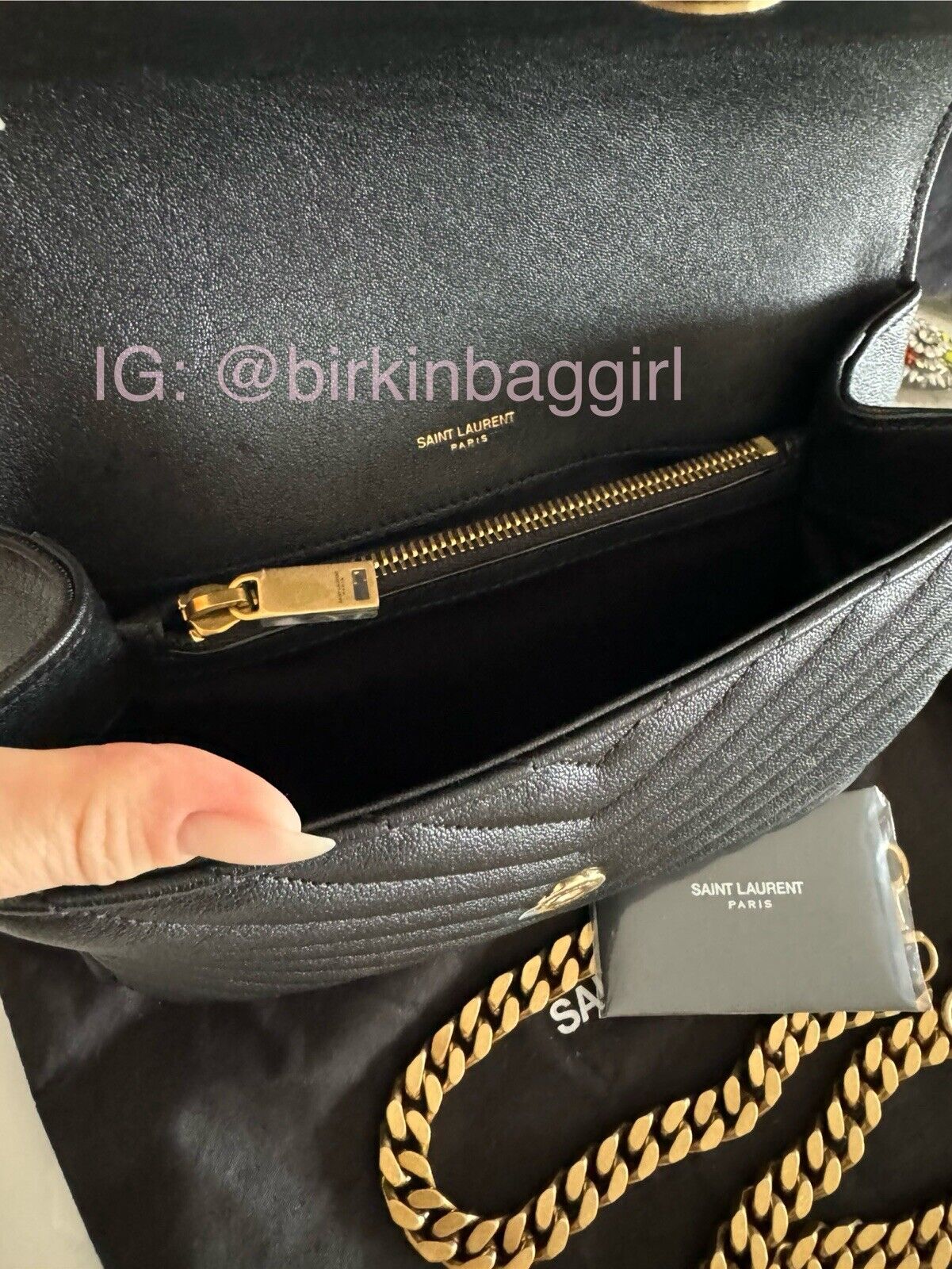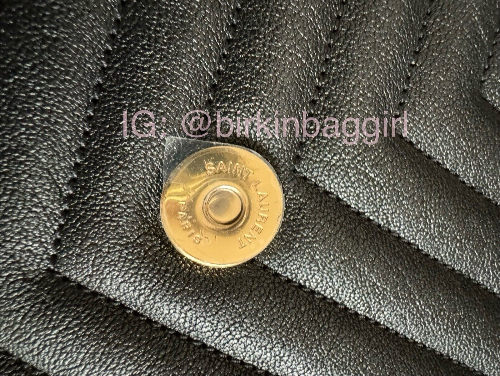 Black textured leather with YSL signature antiqued bronze/gold toned hardware